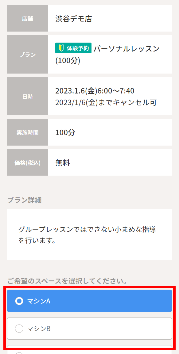 エリア(場所)の選択がある場合はご希望のエリア(場所)を選択してください。